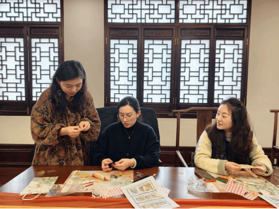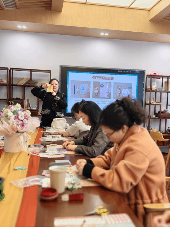 随后,活动进入 “锦承芳华”巧手织锦环节。女教职工们在现场慢享温柔手作时光,沉浸式体验宋锦饰品制作的乐趣。大家先撷取宋锦经典的云纹、缠枝纹纹样,裁丝缕、缀微光,精心制作专属的芳华挂件,让宋锦的细腻纹理映衬独有的温婉气质;再以多彩锦绳为引,串联亲手制作的锦饰,用心编织锦心锦绳,将手作的温度与非遗的厚重紧紧相融。指尖翻飞间,一块块精致的宋锦化作方寸间的美好,大家将春日芳华与节日心意藏于饰品之中,在动手实践中感受非遗制作的匠心,更在沉浸式体验里收获悦己的美好。