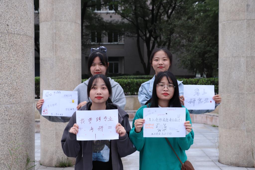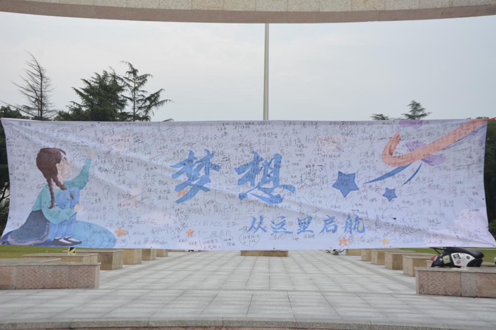 在拍摄人员及班长的组织下,活动有序开展。同学们到文化广场集合后,进行了自由组队。他们将手中的白纸写满自己的梦想和对未来的美好期许,摆出各种动作和队形进行拍摄合影留念。不仅增加了活动的趣味性,也进一步拉进了彼此之间的距离。随后,每位同学还在海报上用黑色马克笔写下自己的梦想和宣言,他们互相讨论、分享自己的梦想,畅想未来。