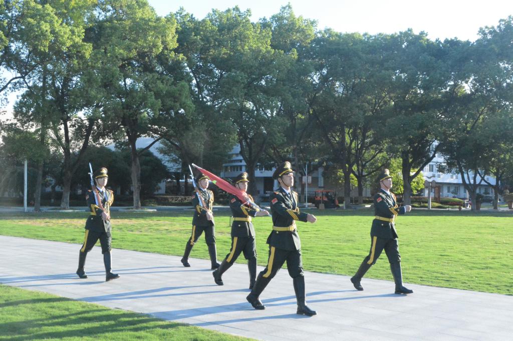 清晨7时整,升国旗仪式开始,国旗仪仗队成员护送国旗走向旗杆,迎着晨曦,他们迈着强劲有力、整齐划一的步伐,踏出了青春的蓬勃朝气。