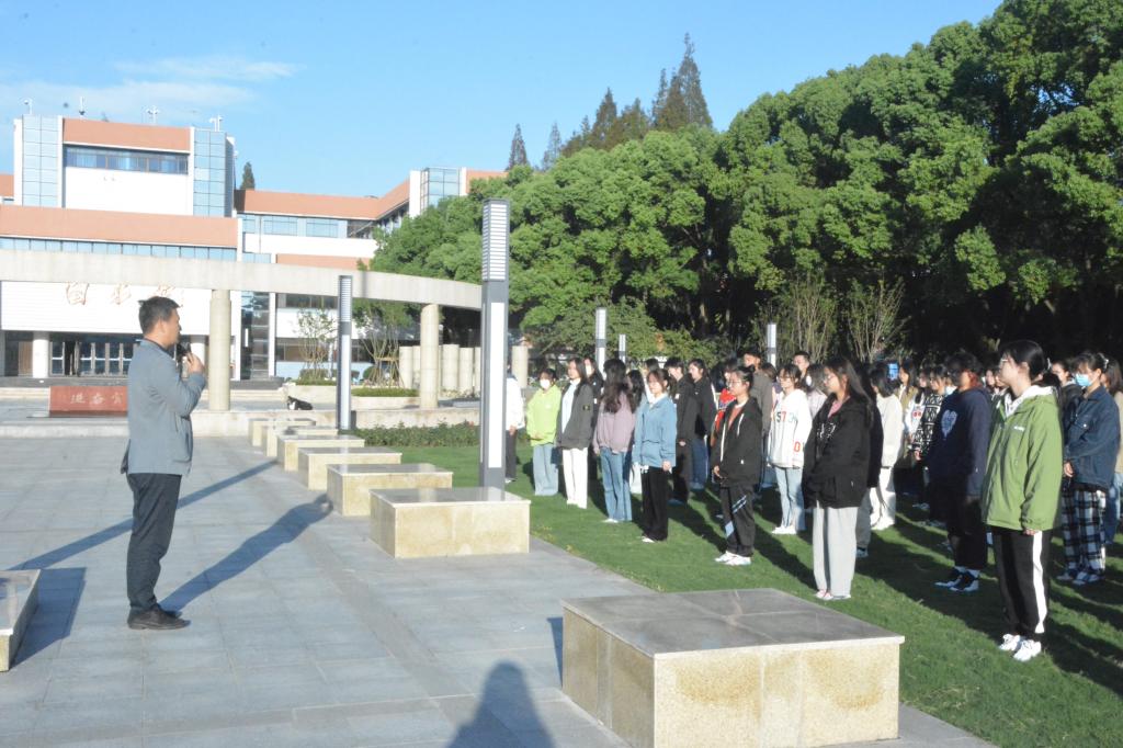 全体师生肃立敬礼,面向国旗行注目礼,奏唱国歌,五星红旗冉冉升起。随后,校团委副书记、院团委委员沈梦可在国旗下发言,她分享了自己退伍复学后从一名共青团员成长为中共预备党员的经历,表达了对党的崇高敬意,并阐述青年的时代责任。她谈及我们要学习和弘扬革命先辈矢志不渝的民族大义,永怀崇高爱国主义精神,汇聚起中华民族伟大复兴的磅礴力量,跑出青春加速度。