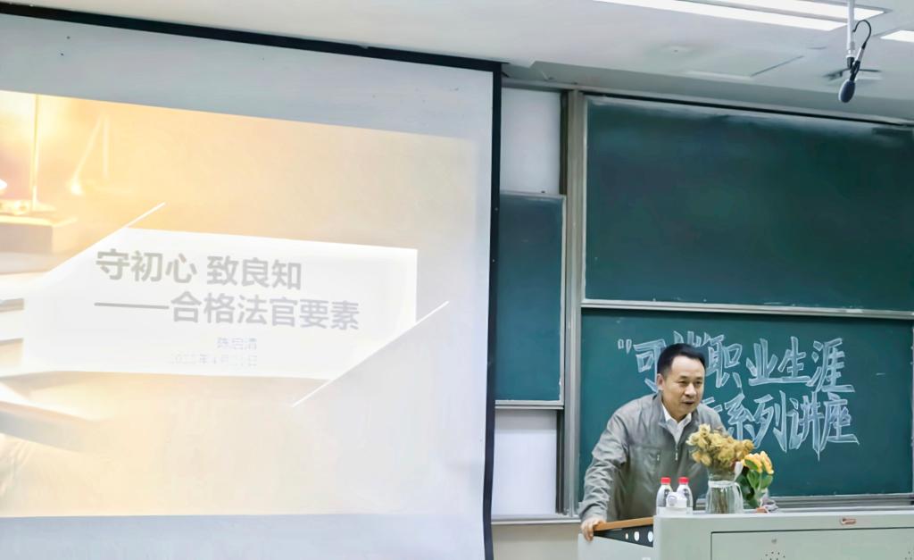 第一讲的主题是“从一名大学生到一名检察官,需要走几步?”,朱依欣专委介绍了检察院内部机构的组成、各机构职能及其相互关系,使同学们较为具体和客观地了解了检察官这一职业第二讲的主题是“考研交流会”,历年考研成功学子代表结合自身考研经历向学弟学妹们用心用情地分享了自身的考研心得第三讲的主题是“如何做一名合格的法官”。陈启清庭长从日常检察和审判实践出发,讲法理、讲办案、讲职业操守,让同学们明晰作为一名法官需要着重培养的能力。