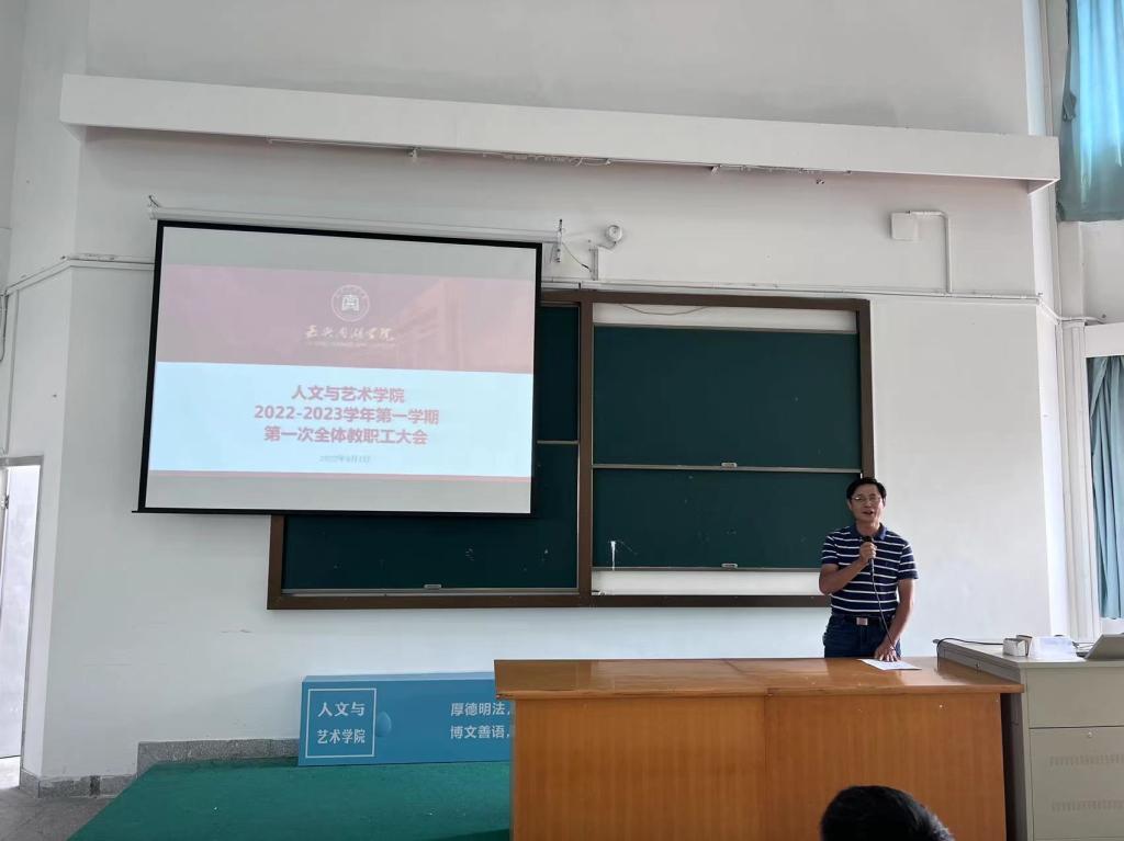 2022年9月1日下午,伟德国际VICTOR1946在人文楼310会议室召开2022-2023学年第一学期第一次全体教职工大会,会议由学院副院长赵伯祥主持,学院党委副书记杨燕群主要传达学校中层干部暑期读书会会议精神。