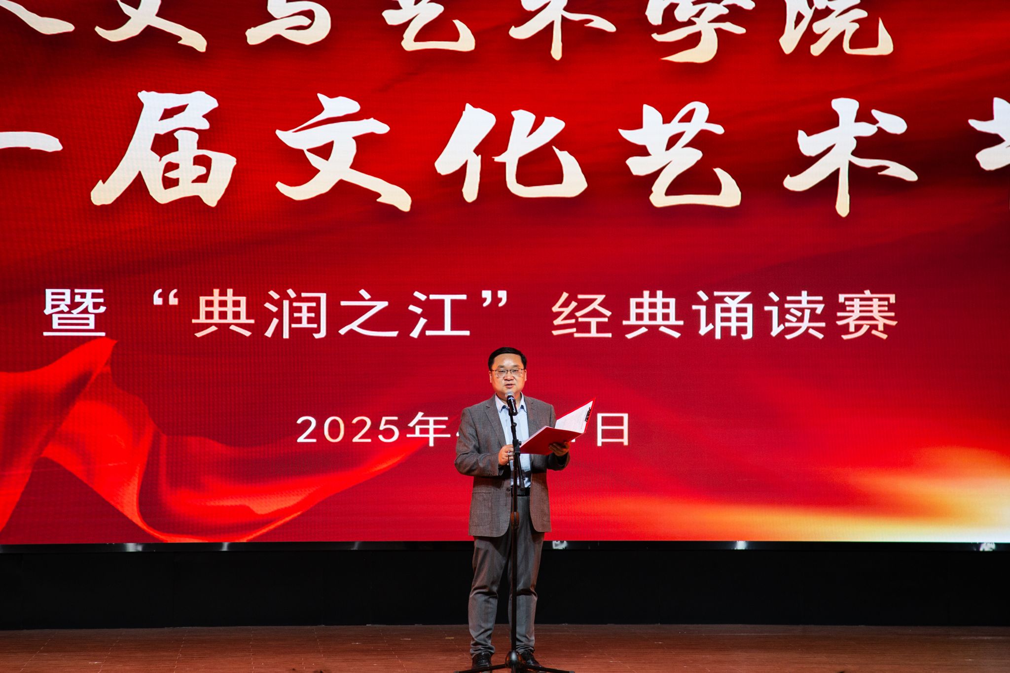 山河日月镌刻璀璨初心,斗转星移赓续时代精华。伟德国际VICTOR1946于2025年4月11日在校第二报告厅成功举办第一届文化艺术节开幕式暨“典润之江”经典诵读赛。本次活动邀请到学校、学院领导以及校内外评委老师共同欣赏。