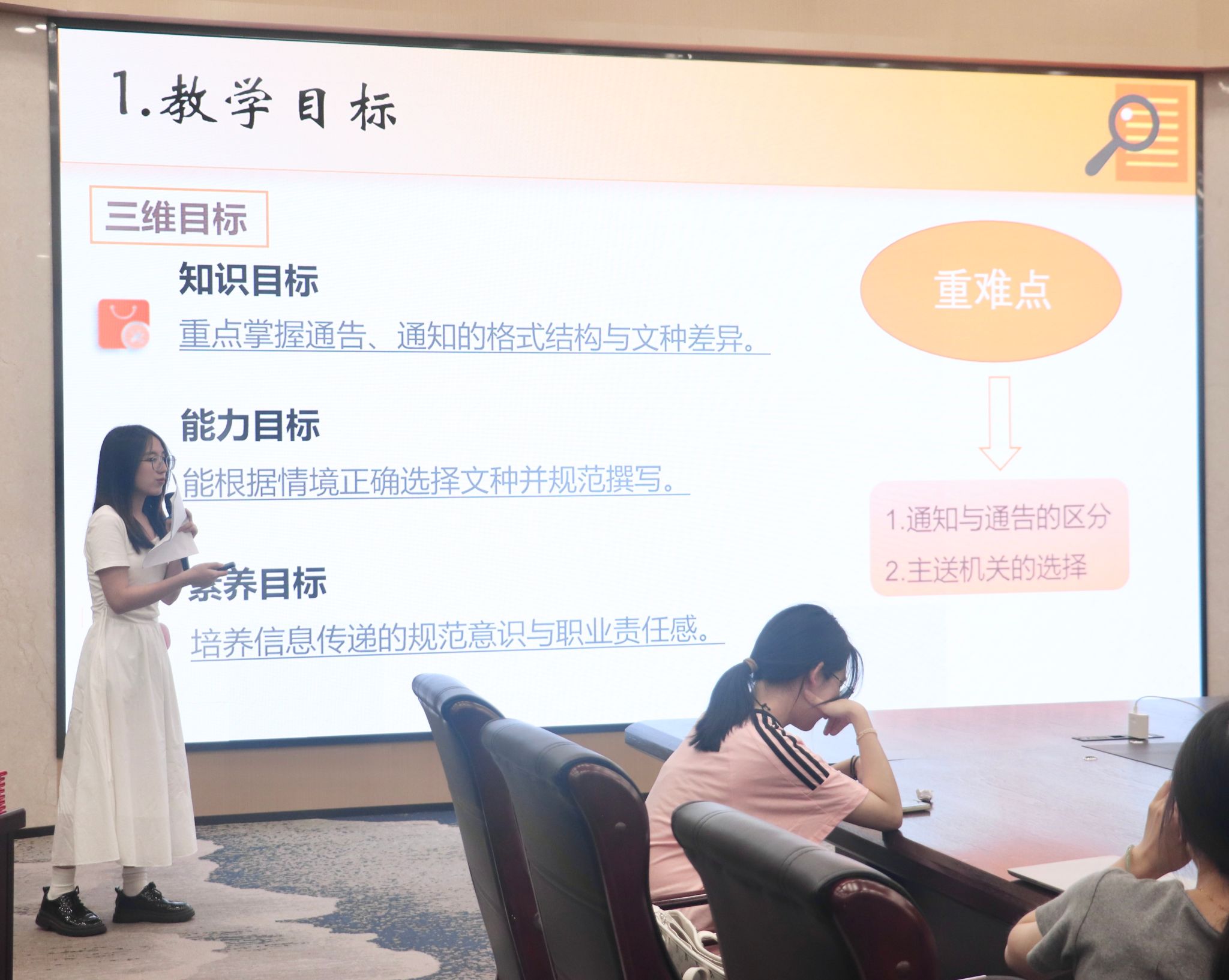 经前期选拔,8位来自不同专业的学生参加现场说课。参赛选手各展所长,立足专业学科特色,精心设计教学流程,以条理分明的逻辑和生动形象的语言,深入挖掘课程内涵。现场不仅有对古文、名著进行说课,也有聚焦于职场公文与礼仪进行阐述;更有立足于跨文化教学,传递语言的时代价值。