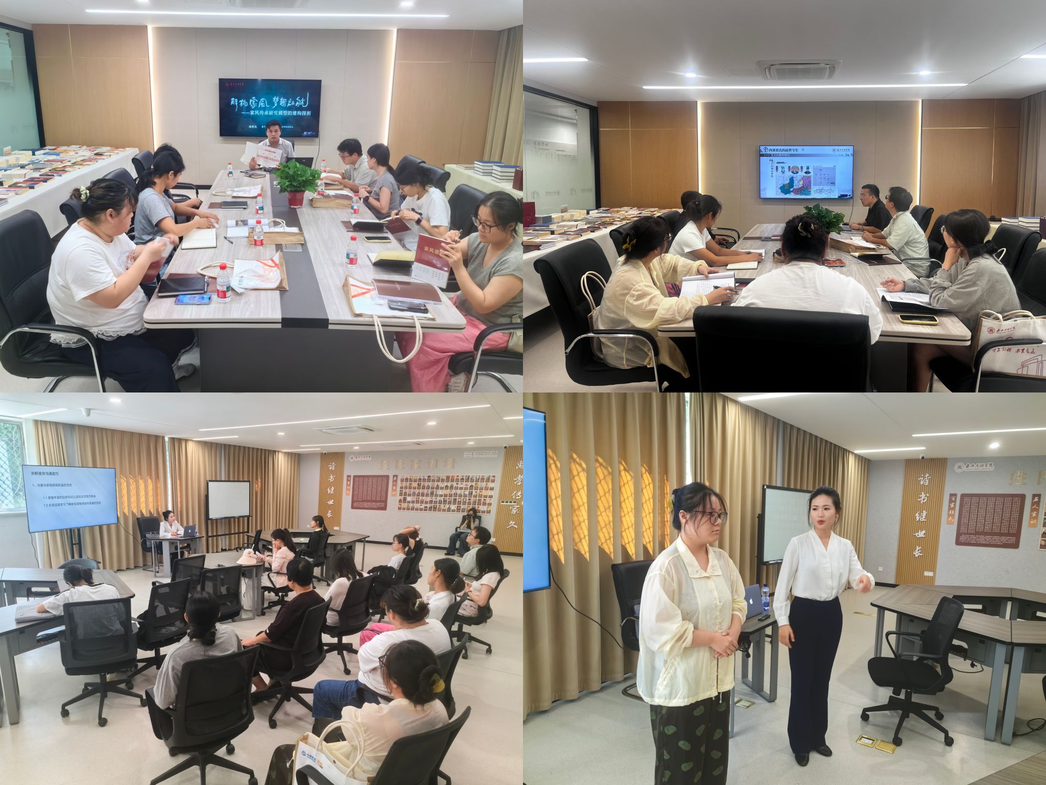 培训班上,学院副院长潘晓侃根据专著《解构家风密码》,为培训班学员系统性讲解“1-11-33-99”家风研究范式的内在逻辑,并借助耳熟能详的家风故事深入挖掘家风点位内涵。嘉兴南湖红源文化发展有限公司讲解员戚益君、发展规划处干部王帅,以西溪家风馆展陈体系为练习内容,开展模拟讲解实践活动,切实提升培训班学员临场应变、讲解礼仪、口语表达等综合能力。