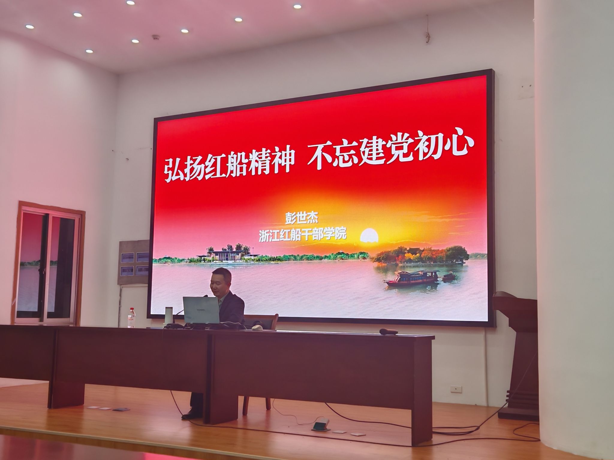 4月9日晚,浙江红船干部学院、中共嘉兴市委党校党史党建教研室主任彭世杰教授来院为2025级全体学生宣讲,本次宣讲主题为“弘扬红船精神 不忘建党初心”。